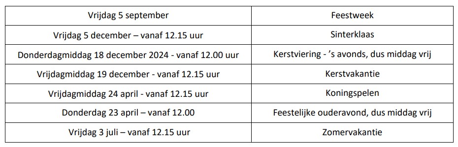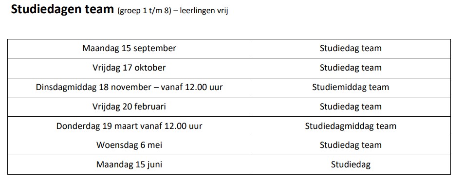 De basisscholen en de scholen voor voortgezet onderwijs trachten zoveel mogelijk gelijk vakantie te houden. Dat kan niet altijd. Vanuit het directieoverleg vindt er overleg plaats met het voortgezet onderwijs. Voor elke school blijft er ruimte over voor het plannen van enkele studie(mid)dagen.